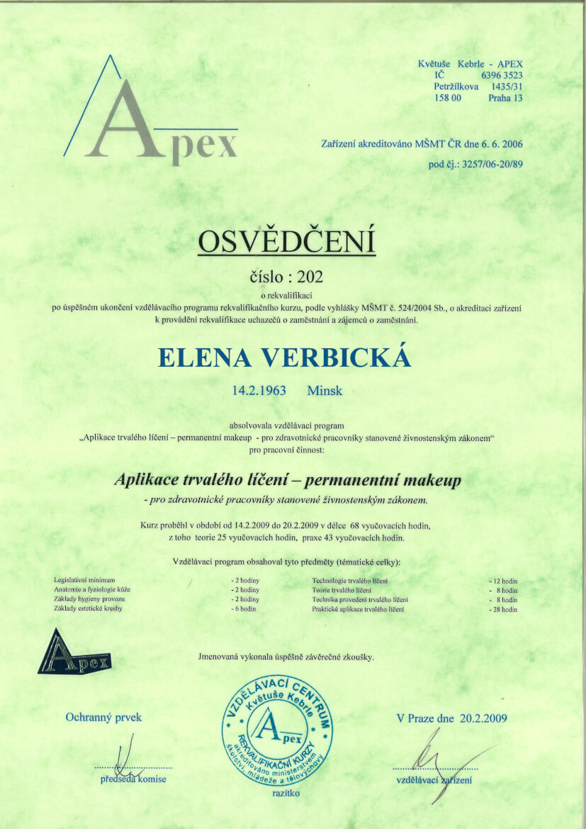 Обсуждение того, у кого больше практики или художественного таланта, несколько вводит в заблуждение и не имеет отношения к делу. Не имеет значения, работает ли косметолог (визажист) в Праге, Брно, Пльзене, Остраве или в другом городе. Но нанесение перманентного макияжа - это в какой-то степени медицинская процедура, поэтому моим огромным преимуществом является медицинское образование и практический опыт работы медсестрой.
